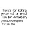 Please give Jim a call at (541) 354 9966 or email jim@hawkeyedesign.com for current availability.